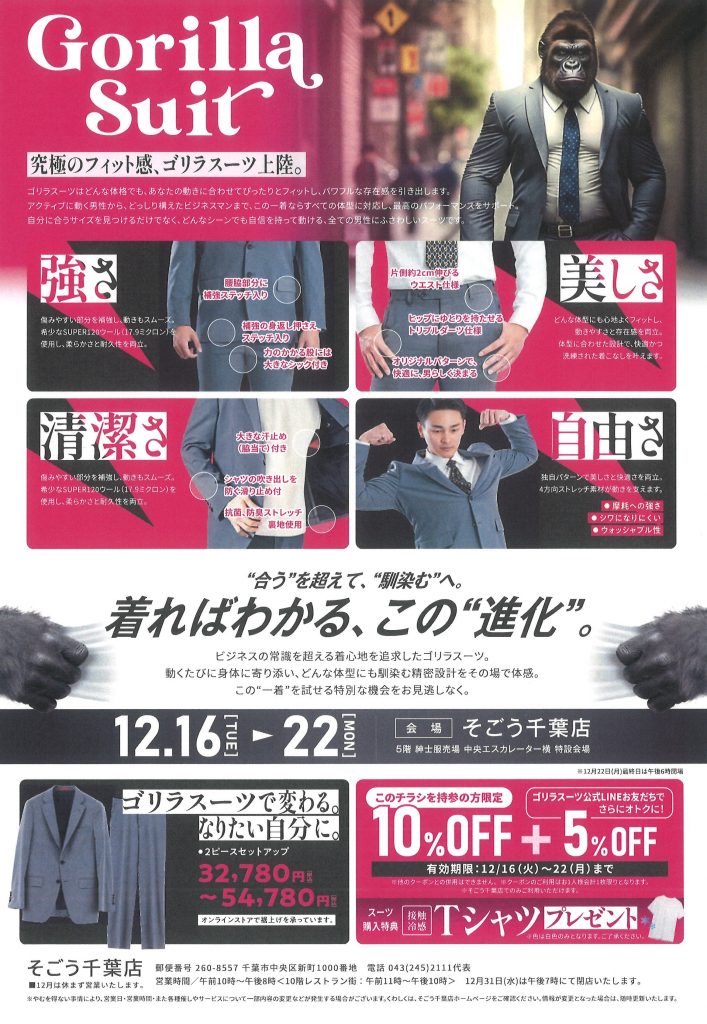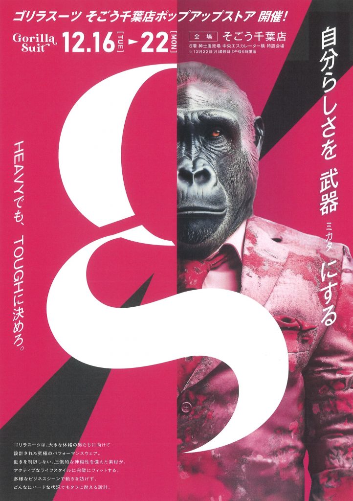 12月16日(火)~22日(月)そごう千葉店で「ゴリラスーツ」の期間限定店を開きます。関東では初の開催となります。