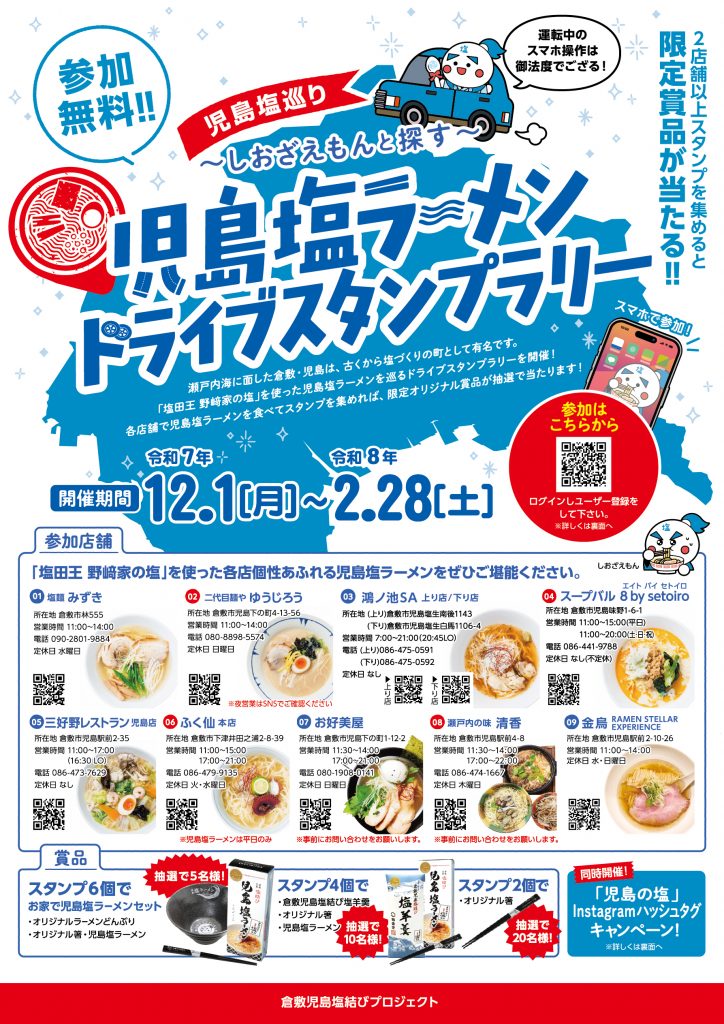 「児島塩巡り~しおざえもんと探す 「児島塩ラーメン」 ドライブスタンプラリー~」はその名のとおり児島塩ラーメンを周るスタンプラリー。美味しい児島塩ラーメンを食べて、素敵な賞品を当てよう!2つ以上スタンプを集めた方の中から抽選で賞品をプレゼント♪スマホ1台でスタンプ取得からプレゼント応募まで、どなたでも簡単に参加できます。美味しい児島塩ラーメンを堪能し、児島の美しい景色を見て、感じて、瀬戸内の魅力を存分に楽しみましょう!!