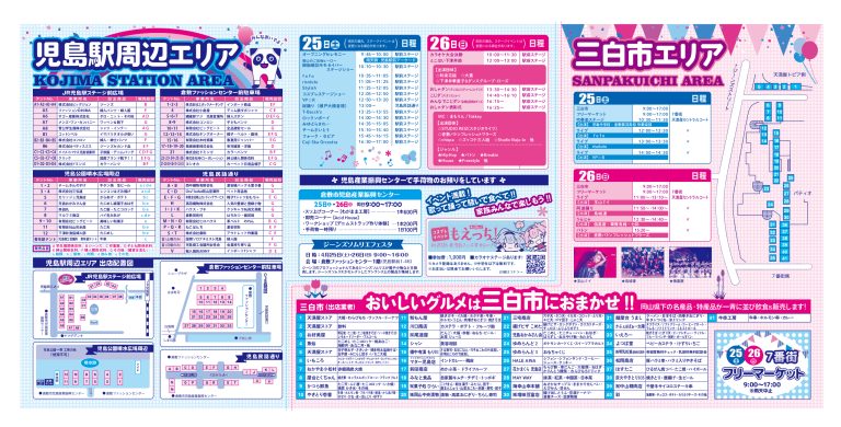 「児島駅周辺エリア」「三白市エリア」「ジーンズストリートエリア」の3つのエリアごとに、さまざまなイベントが盛りだくさん!