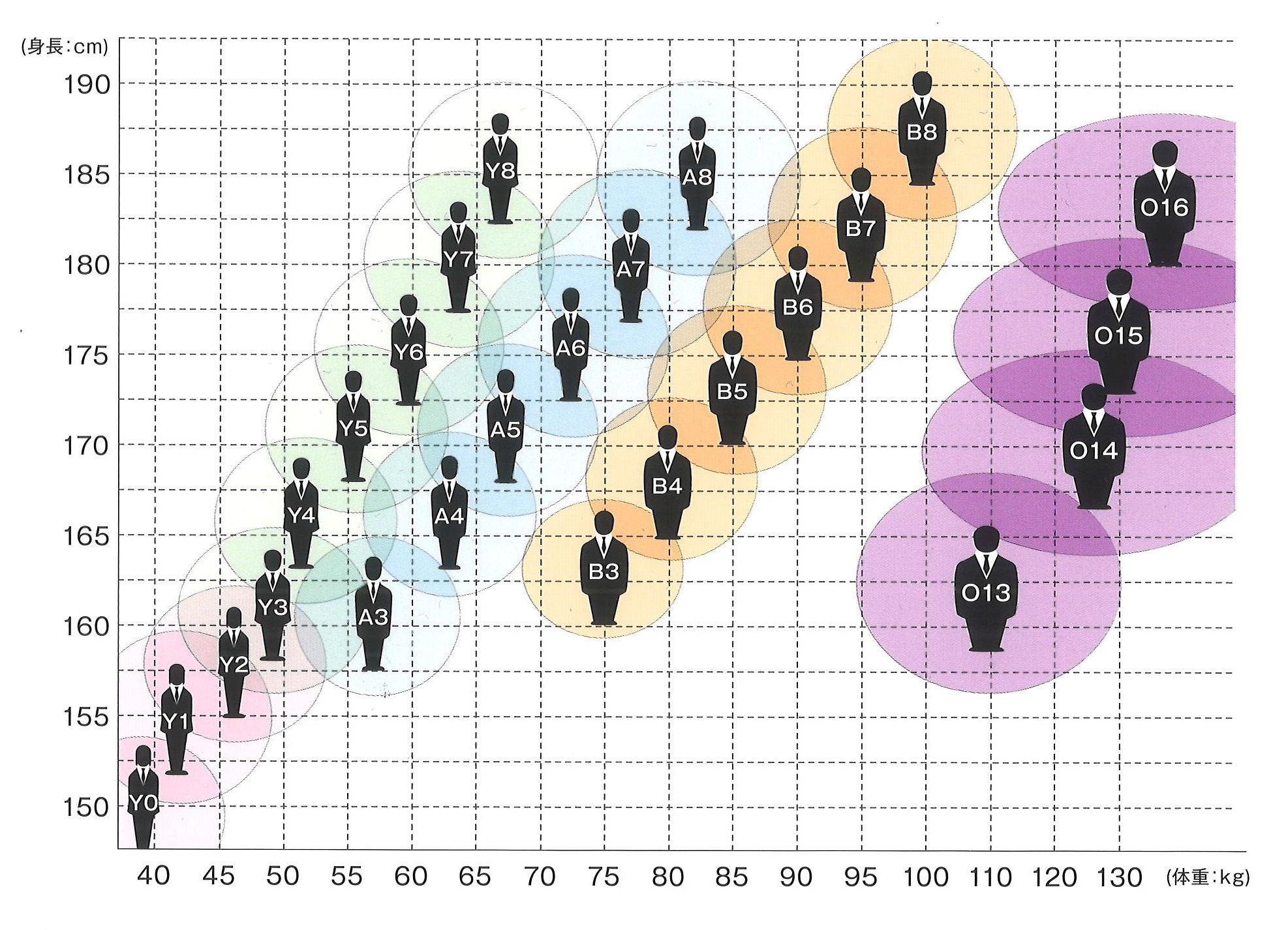 標準体型をA体とし、Y体はA体に比べて細身となっております。B体はふくよかな方に合うサイズ、O体は体重が100㎏以上の肥満体型の方に合うサイズとなっております。